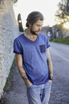 Single Jersey aus Flammgarn und gekämmter | ringgesponnener Bio-Baumwolle | Aufwändige Spray Print Technik V-Ausschnitt | Bündchen mit Elasthan Brusttasche in Kontrast 9 x 10 |5cm